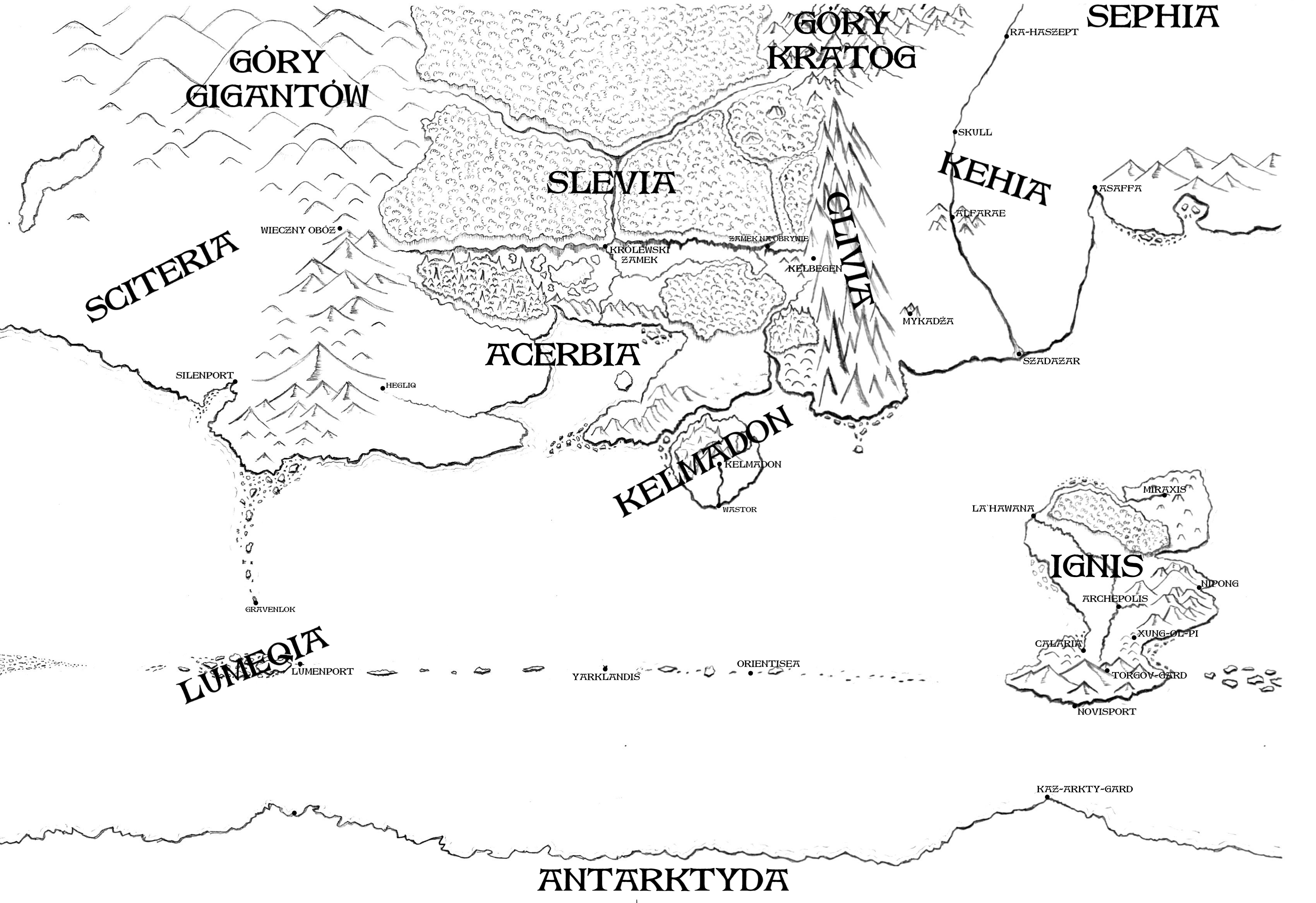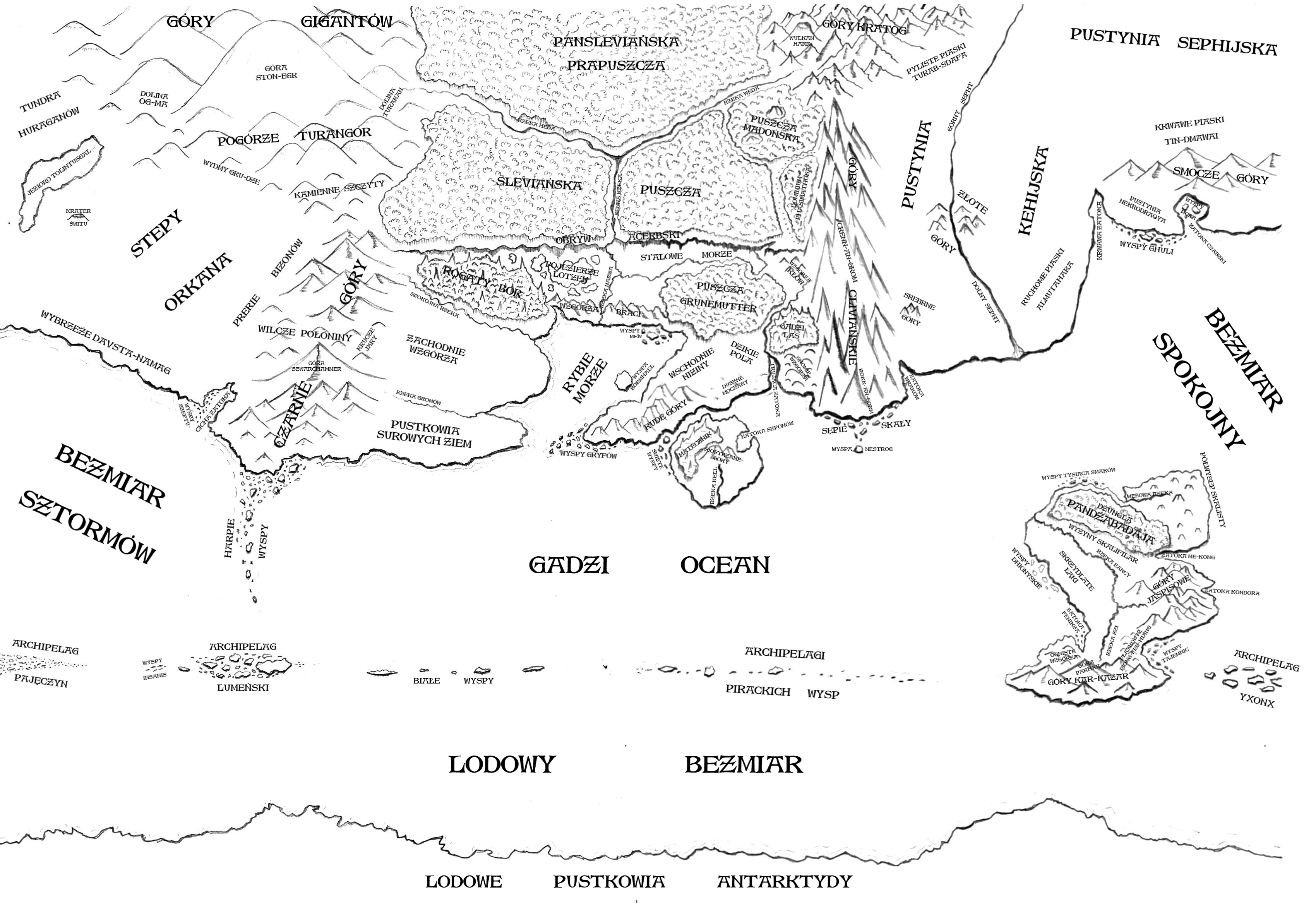 A poniżej geograficzna mapa znanego świata, a na niej... pasma górskie i ich najwyższe szczyty; rzeki i jeziora; puszcze, lasy i knieje; morza i oceany; wyspy i archipelagi...